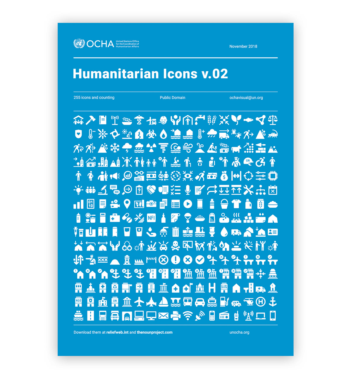 UNOCHA has offices and responds to crises all over the world. The icons are based on the inputs received from colleagues in the field, but also address requests from other humanitarian organizations and UN agencies. They cover many themes of interest to the humanitarian community, from natural disasters – such as tsunamis and earthquakes – to relief supplies, such as water containers and shelter kits. They also cover complex humanitarian themes such as “access to people in need” and “protection of civilians.”