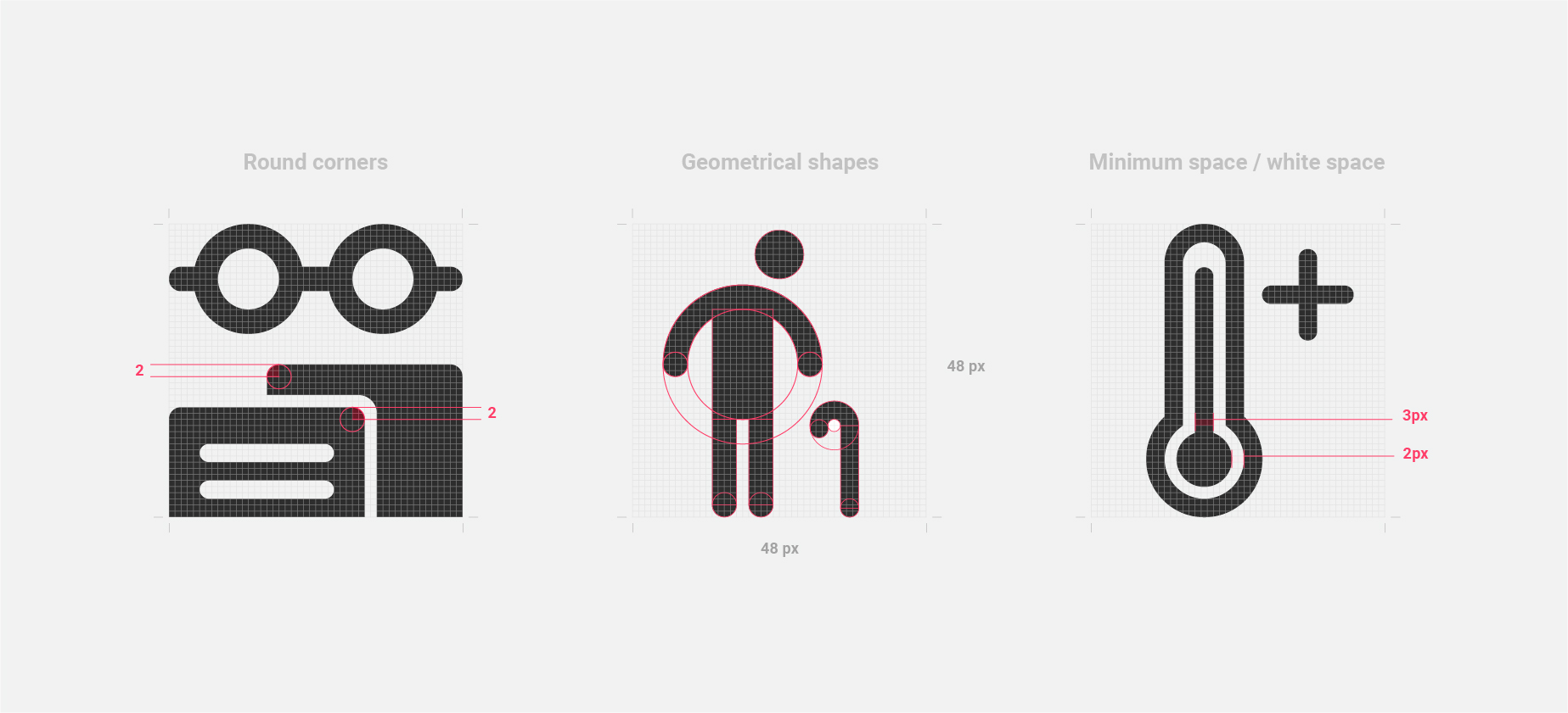 OCHA’s icons are used throughout the range of information products developed by and for the humanitarian community, such as maps, reports, infographics, and websites. This requires a strong and coherent visual style that allows the collection to live and survive in a wide variety of formats and applications. Creating strict style guidelines I helped to define the character of the collection. To start, the team established basic elements that would define the visual language of the complete icon collection, such as color palette, stroke weights, grid, corner rounds, white space and Icon style (Glyph, Outline, etc). As the main goal of the Humanitarian Icons is to be able to be represented in multiple formats we decided to make the collection based on Glyph Icons, otherwise called Solid Icons. When creating such a large collection, grids are crucial to producing a coherent style and solid icon set. We defined our grid to be 48px to 48px.
