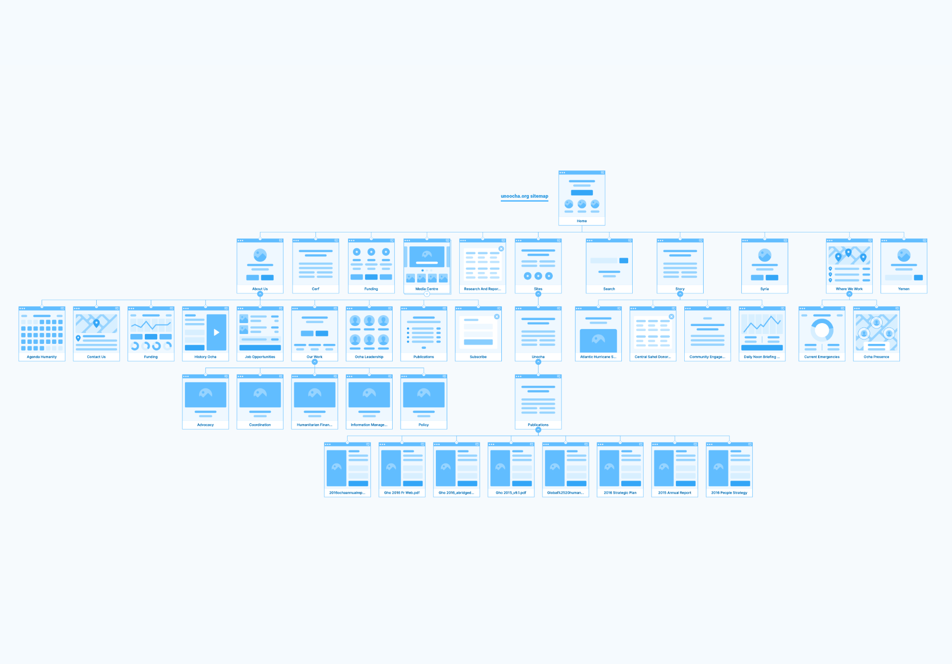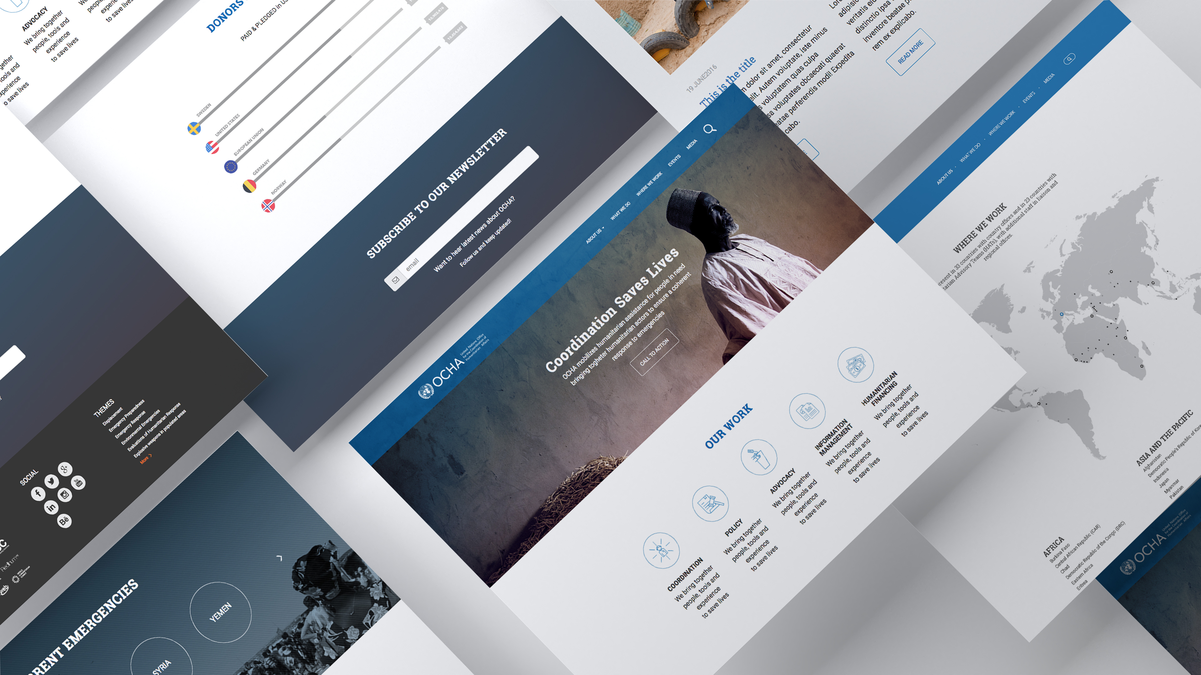 We employed a user-centric approach to defining and testing the Information Architecture for the reimagined unocha.org website. A modernized visual-design concept was applied across the wireframes, updating page layouts, font types and sizes, color palette, logo, and branding. Numerous iterations of the home page were circulated among OCHA teams and stakeholders, and a variety of comments and reactions informed the direction, including existing web trends and standards, the timeliness and reliability mandate of the system, and the partnerships on which information-sharing relies.