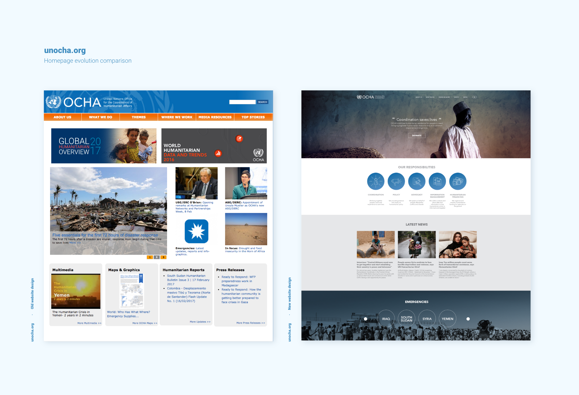 This is a project I worked on during my time at UNOCHA, in the Design and Multimedia Unit formed by one project manager, two UX/UI designers, two web developers and one researcher. I had the opportunity to participate in the project from beginning to completion and provided strategic direction and guidance on the conceptualization, ideation, style, and participate in the redesign process of the website as a UX/UI Designer.