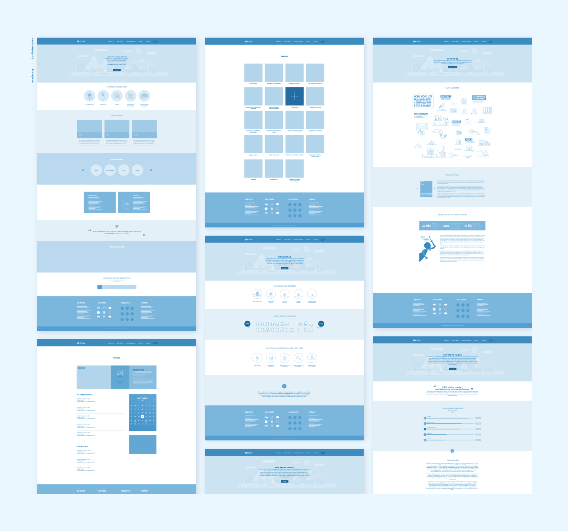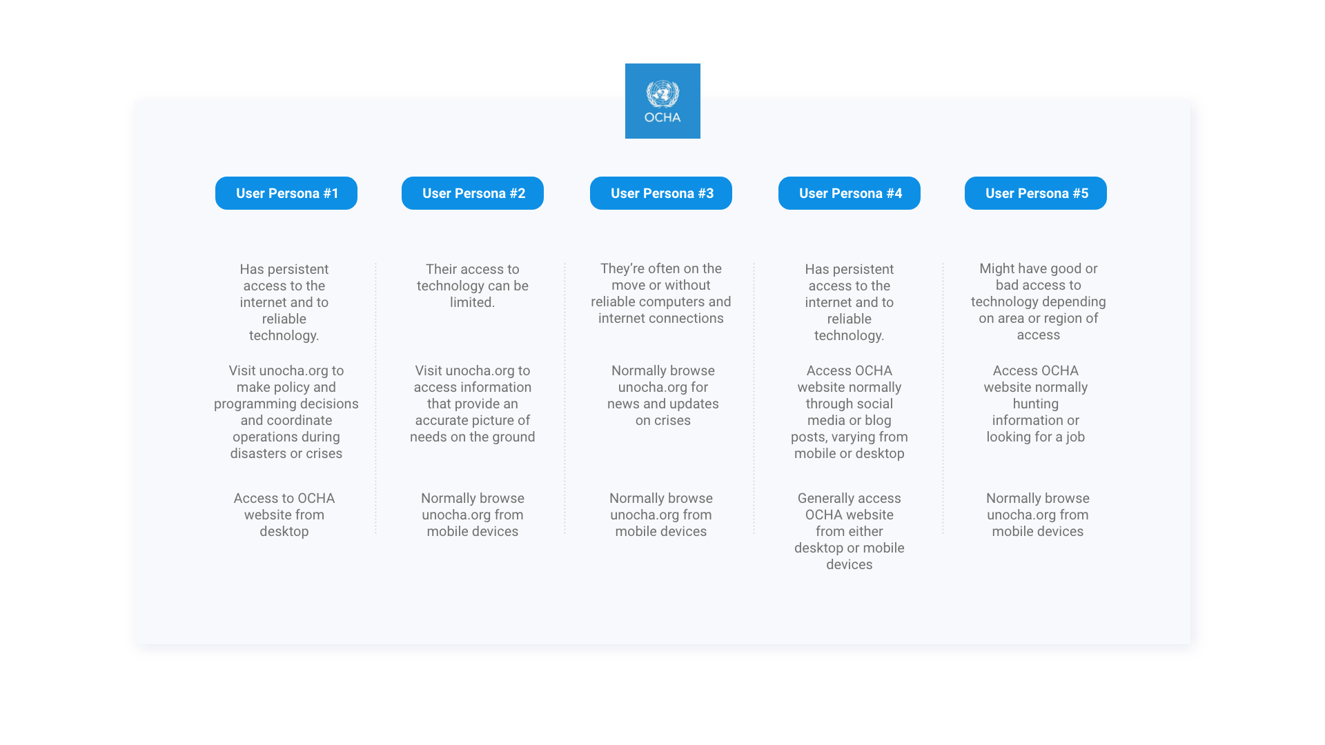Sample user Personas of the website's main users were created, this included: Headquarters-based humanitarian professionals, field-based humanitarian professionals, donor agencies, government officials and new users. In order to build a better understanding of how the unocha.org was used we conducted one-on-one user interviews. We also did an extensive competitor analysis, where we audited information structure, layout, tone and navigation of similar UN agencies and external organizations.